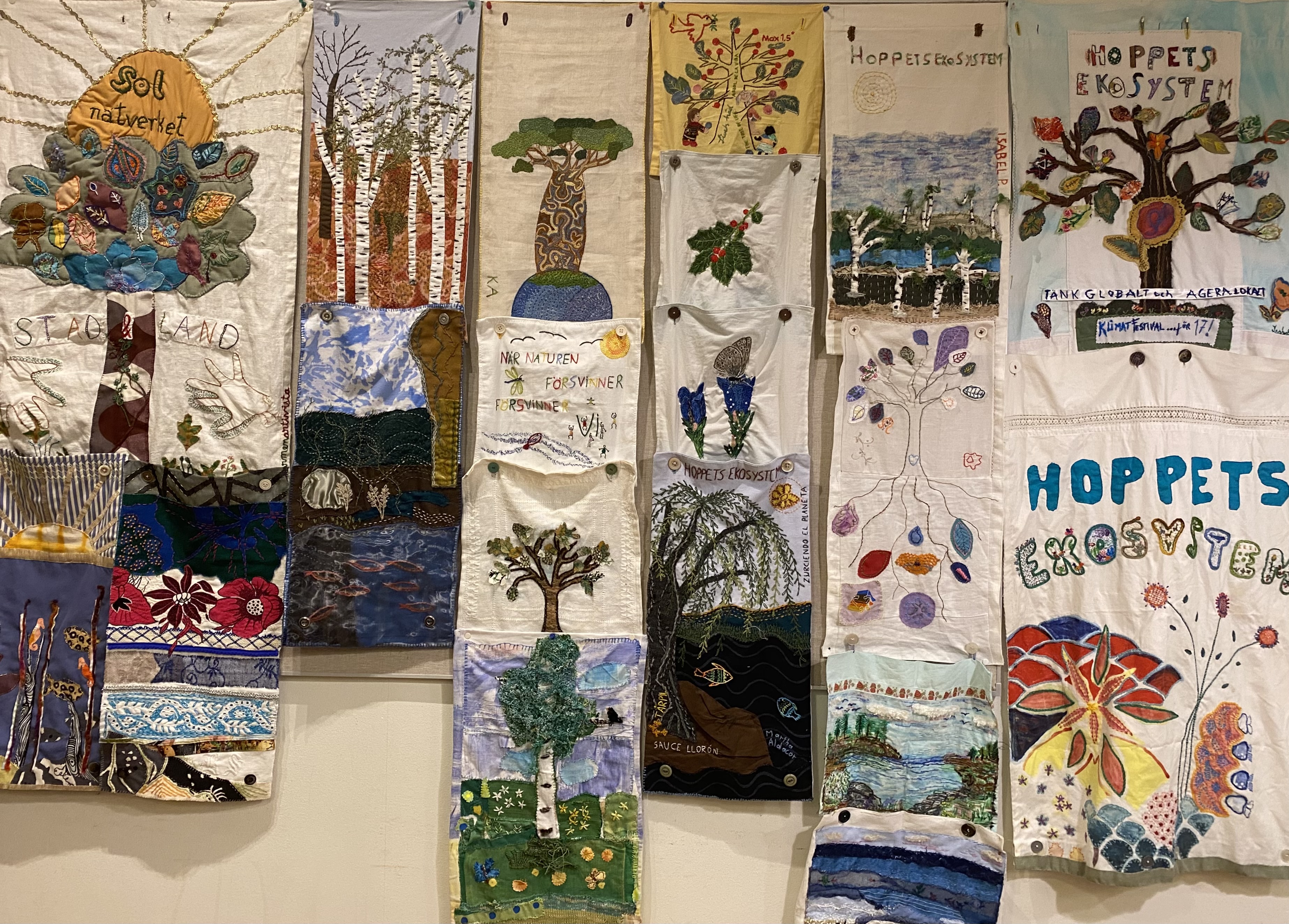 Men, redan från början meddelade vi det latinamerikanska kollektivet att vi ville med hjälp av textilier väcka naturkänsla, och uppmärksamma miljöproblem även i Sverige, men inte minst väcka hopp och de hade inget emot det. På så sätt har några av oss fortsatt att skapa ringar i vattnet och har nu en samling på 15 stycken broderier som lovar att bli fler. En del har gjorts av enskilda brodöser, men flera av de är skapade i kollektiva interaktiva workshop på folkhögskolor, klimatfestivaler, etc. Eller så har de ställts ut på olika offentliga platser och miljörelaterade tillställningar, ex. vis Slow Fashion festivalen anordnat av Gottsunda Dans och Teater, och på andra håll.